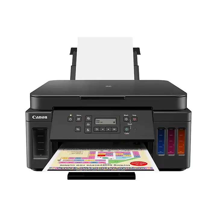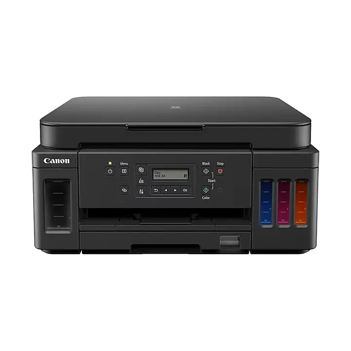 | What’s in the Printer Box | Canon MegaTank PIXMA G6020, ink bottle (cyan) Canon GI-20C, ink bottle (magenta) Canon GI-20M, ink bottle (yellow) Canon GI-20Y |