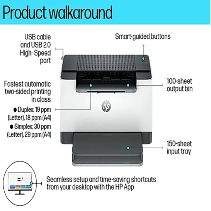• Auto duplex printing; 150-sheet input tray; LED button control panel; Includes USB cable in box