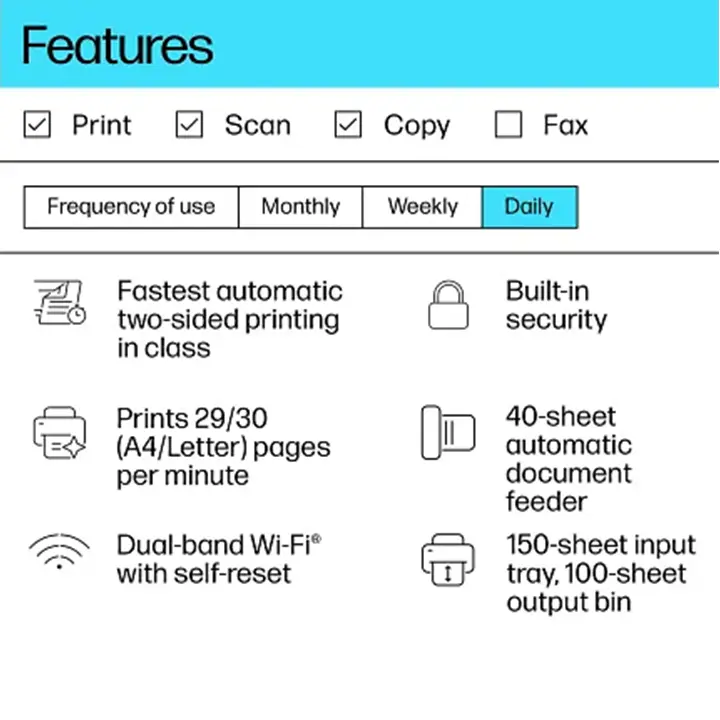 • Auto document feeder, duplex printing, 150-sheet input tray, dual-band wireless 802.11b/g/n, Bluetooth
